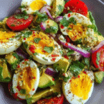 This salad is not only healthy but also visually appealing, with vibrant colors from cherry tomatoes, red onion, and fresh cilantro. Its creamy texture from the avocado pairs perfectly with the tender, protein-rich eggs, making it both hearty and refreshing. Itโs ideal as a quick breakfast, a post-workout lunch, or even a light dinner.